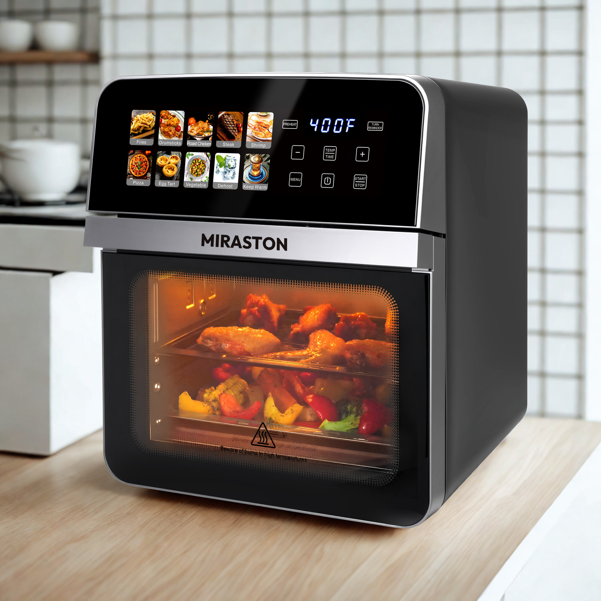 Dual-layer rack system: The MIRASTON Air Fryer Toaster Oven can cook 2 dishes at once (e.g., roasted veggies on top + fluffy baked potatoes below) for fast, balanced weeknight meals