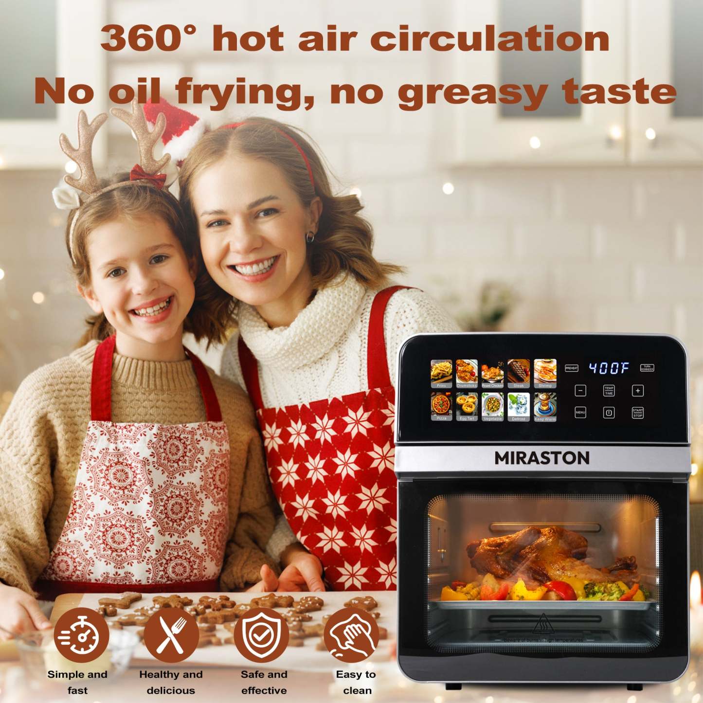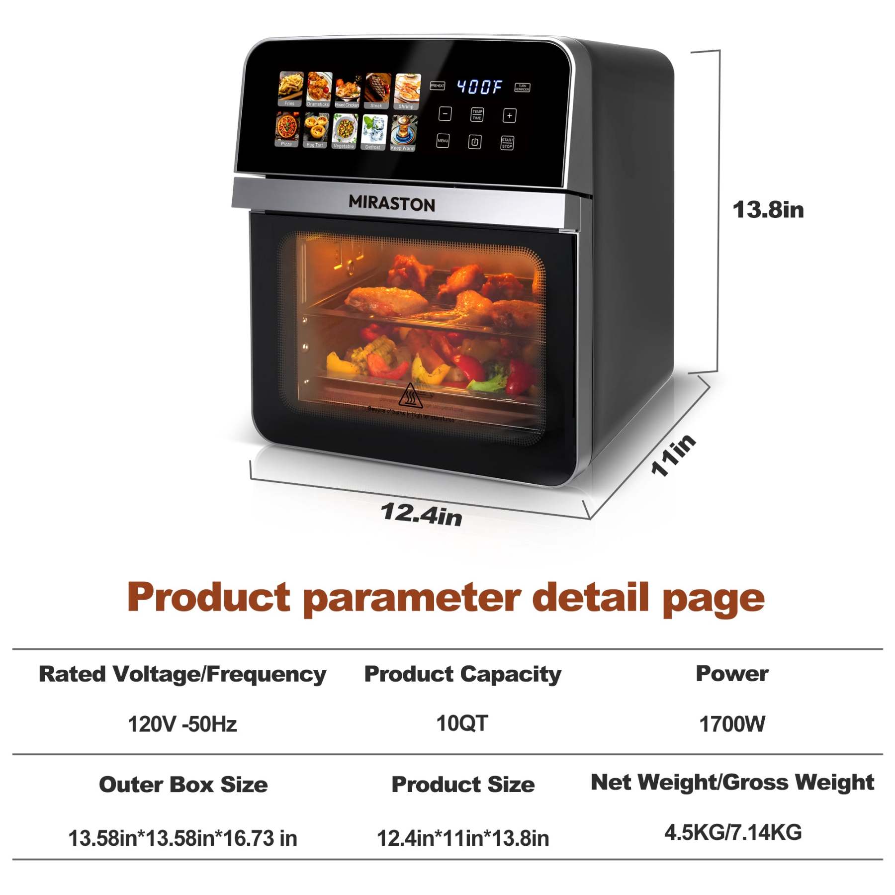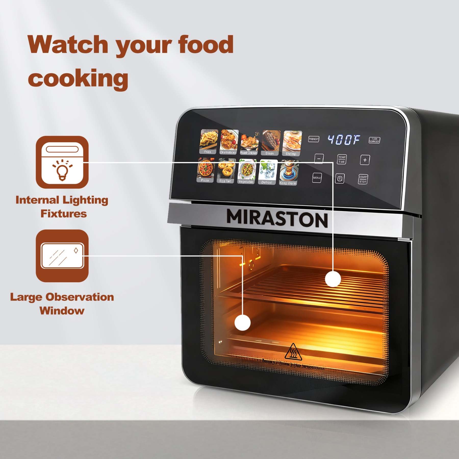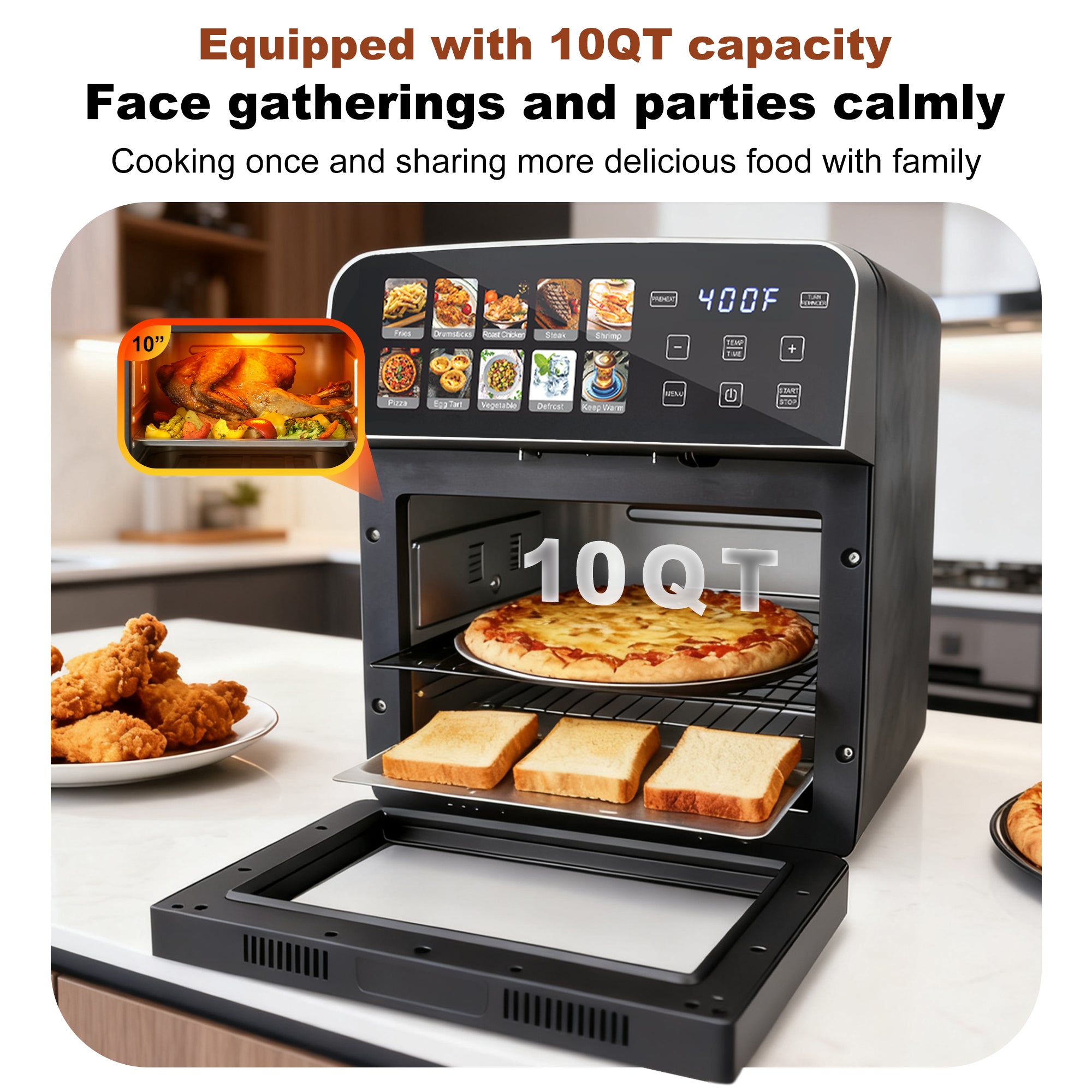 Tap, set, and savor! The intuitive digital touchscreen offers one-touch presets for fries, chicken, steak, pizza, and more. Transform frozen ingredients into restaurant-quality meals in minutes—no culinary skills required!