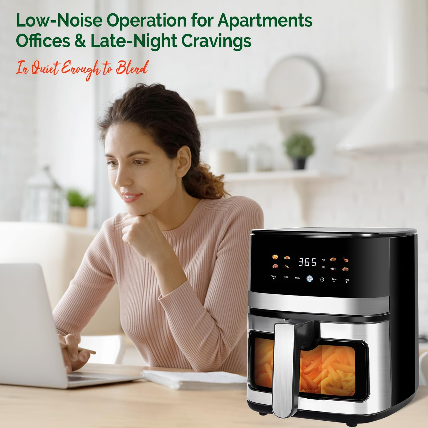 - Visible Monitoring: Equipped with a visual food cooking basket, glass viewing window, and built-in indoor light for easy monitoring without opening the basket.