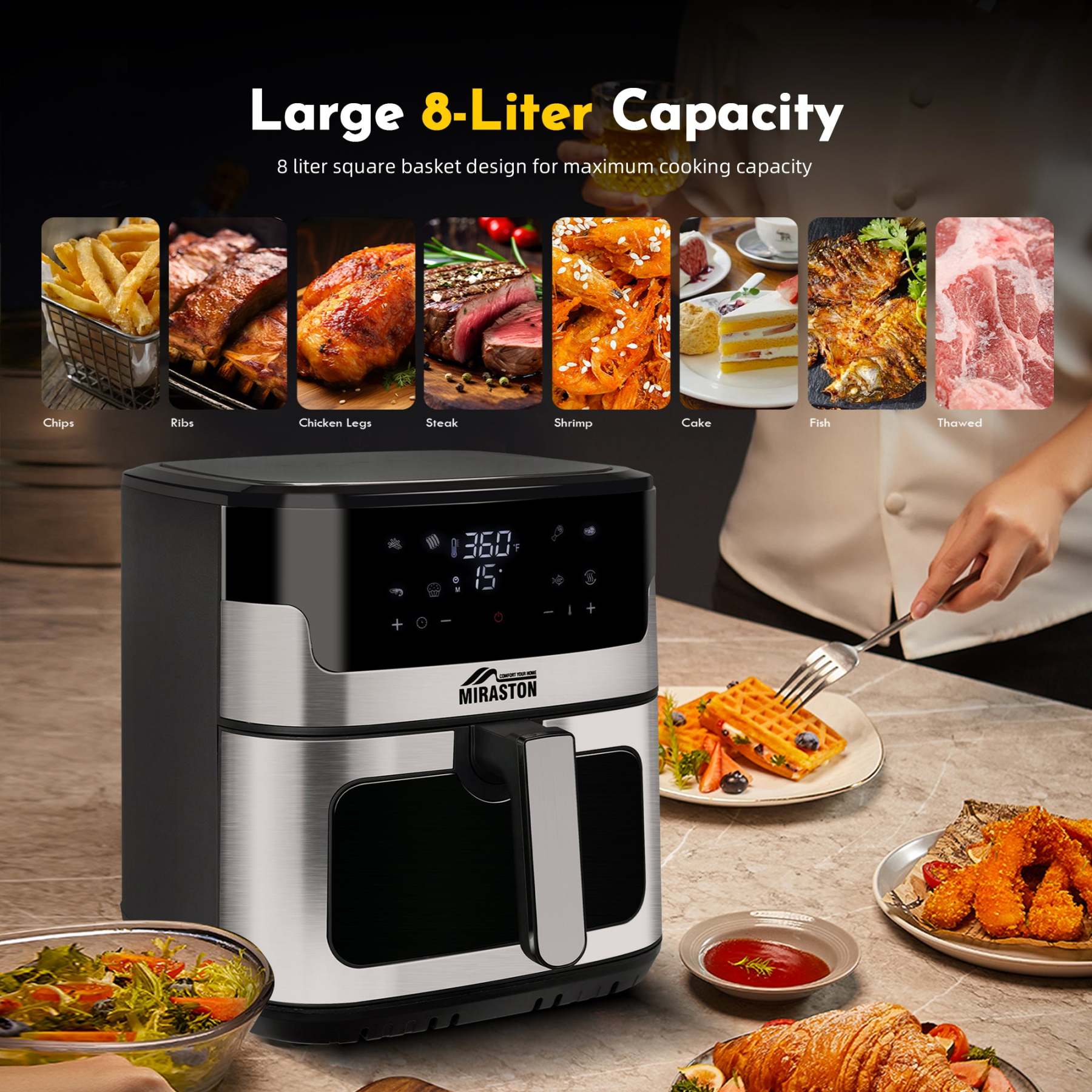 【Enhanced Cooking Capacity】With an upgraded 8.5qt/8L capacity, MIRASTON Air Fryer allows you to cook larger portions, from crispy fries to juicy chicken, our air fryer offers a wide range of cooking options, making it easy to prepare a variety of delicious meals for you and your family.